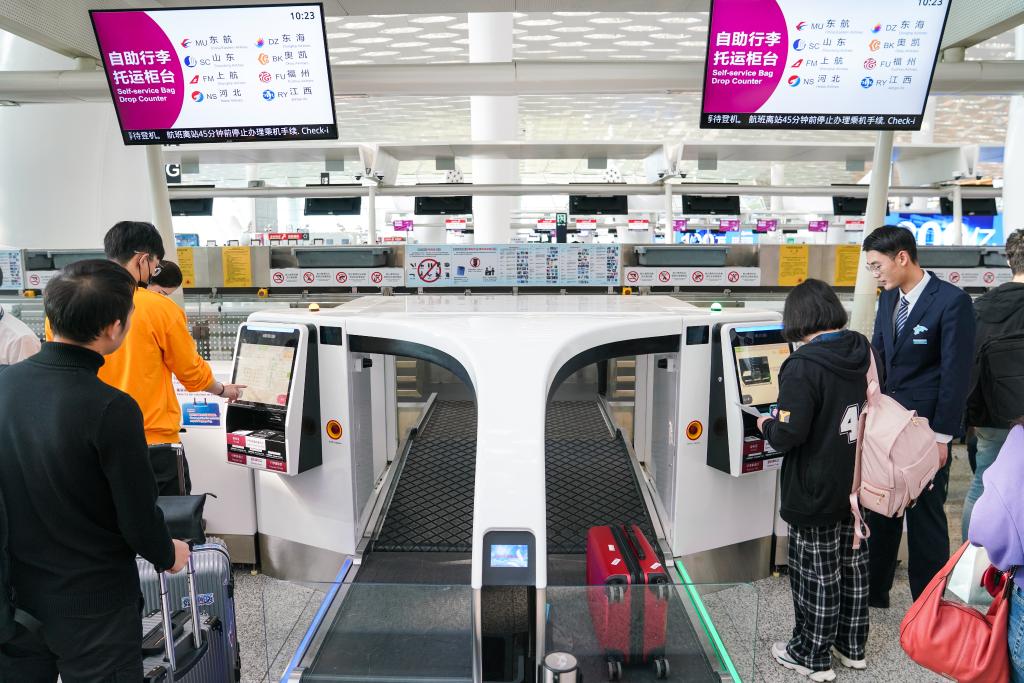 旅客在深圳机场出发大厅体验自助行李托运。新华社记者毛思倩 摄