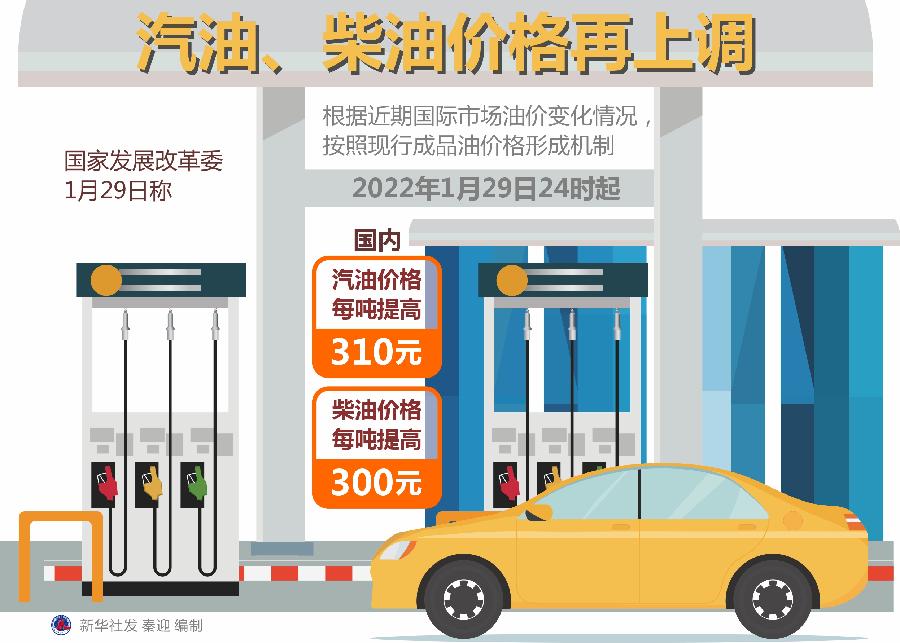 新华社北京1月29日电(记者安蓓)国家发展改革委29日称,根据近期国际市场油价变化情况,按照现行成品油价格形成机制,自2022年1月29日24时起,国内汽油、柴油价格每吨分别提高310元和300元。