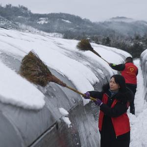 2月7日,杭州市临安区太湖源镇的党员志愿者在蔬菜基地帮助农户清理大棚上的积雪。新华社记者 徐昱 摄