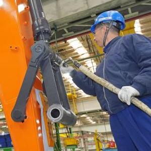 2月7日,在山东烟台一家工程机械生产企业,工人在生产车间内忙碌。新华社发(唐克摄)