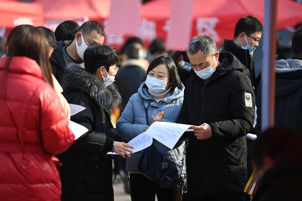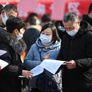 2月9日,湖北省襄阳市人力资源和社会保障局联合樊城区举办春风行动暨“三安行动”招聘会,这是求职者在招聘会上了解岗位信息。新华社发(谢勇 摄)