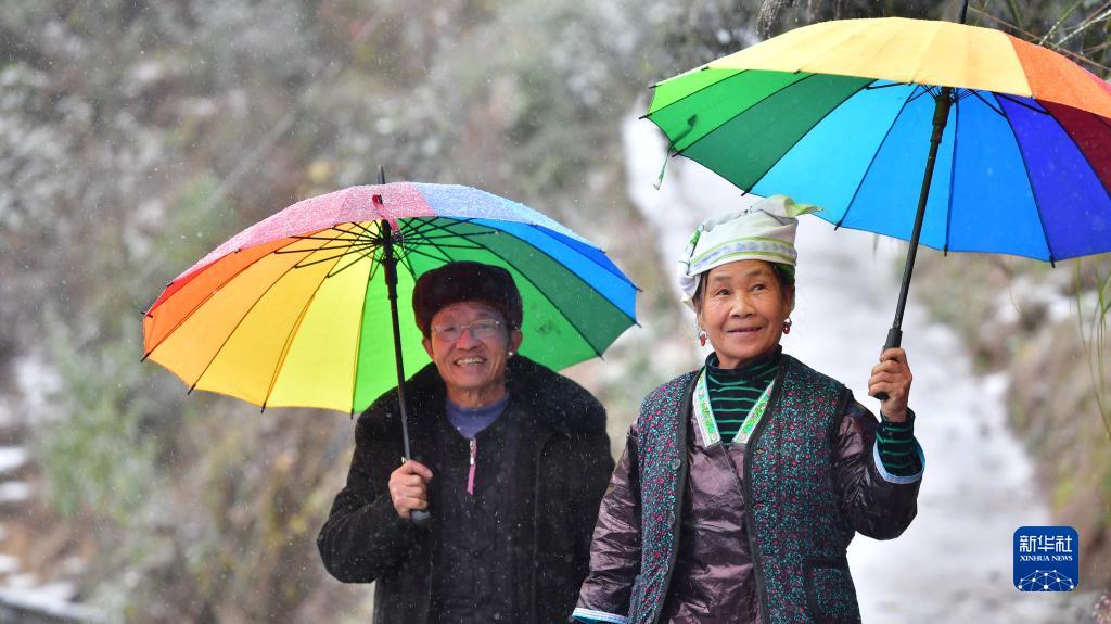 在乌英苗寨,村民梁安合和妻子梁英迷在赏雪(2021年12月26日摄)。乌英苗寨位于桂黔交界的大苗山深处,曾经是一个极度贫困的苗寨。2020年,乌英苗寨实现整体脱贫。新华社记者 黄孝邦 摄