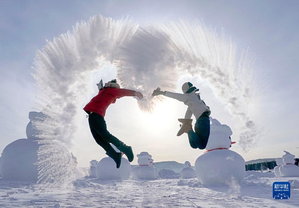 2019年1月24日,在黑龙江省漠河市北极村,游客体验“泼水成冰”游戏。新华社记者 才扬 摄