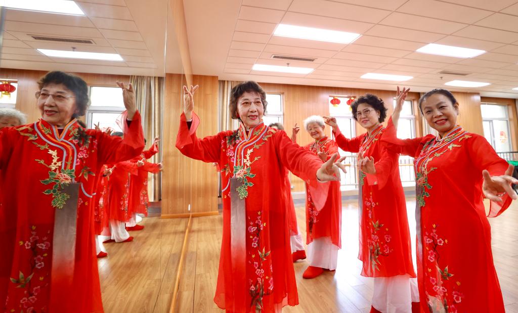 在三河燕达金色年华健康养护中心,老人们排练京剧《梨花颂》。(贾珺 摄)