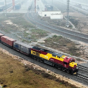 2022年1月15日,广西新年首趟西部陆海新通道年货班列从钦州港东站驶出(无人机照片)。新华社记者 张爱林 摄