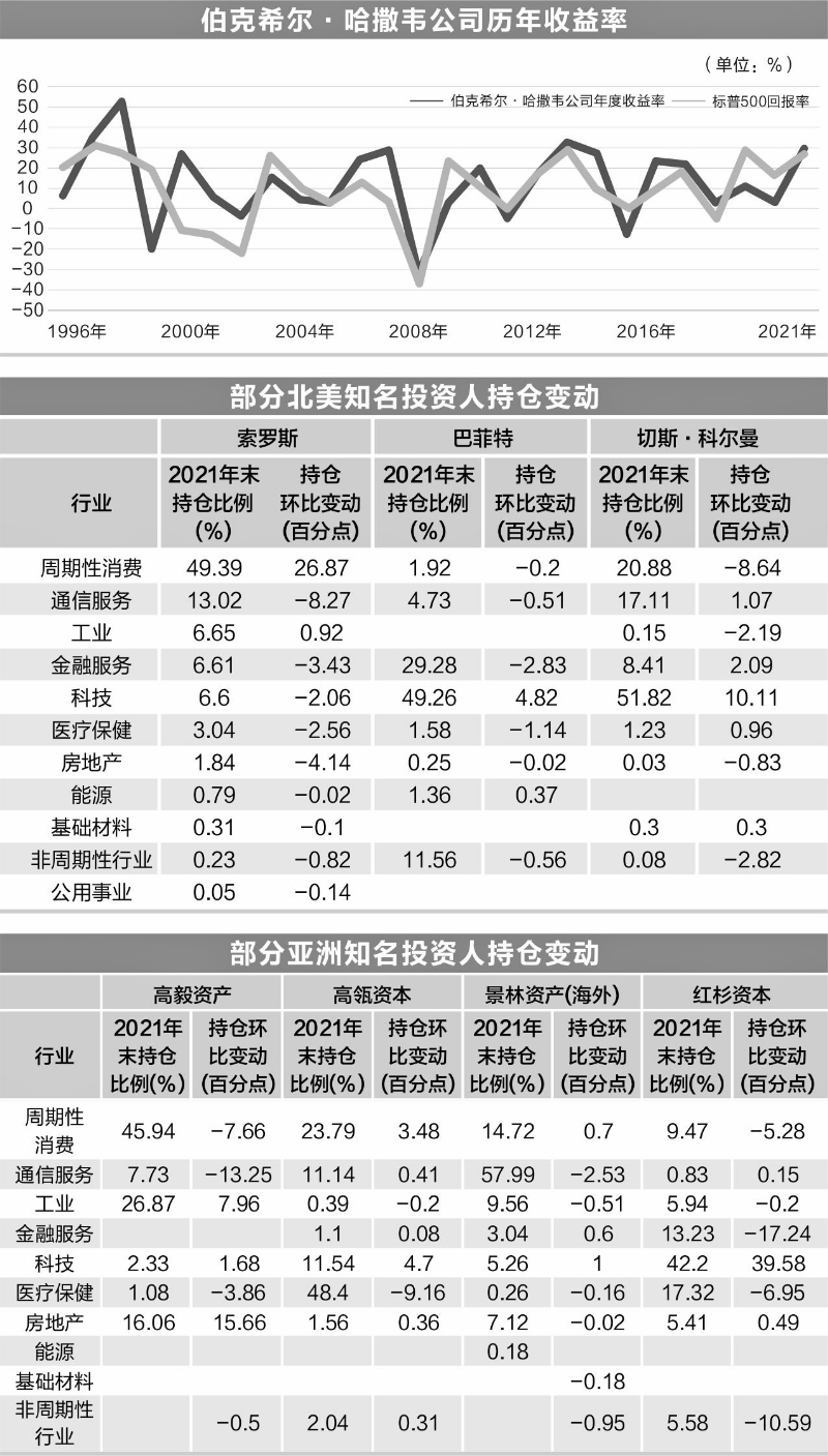 全球知名投资人2021年末的持仓陆续公布,巴菲特、芒格、索罗斯、张磊等人的持仓备受关注,持仓变动代表他们对未来的预判,对投资者把握投资方向有一定帮助。