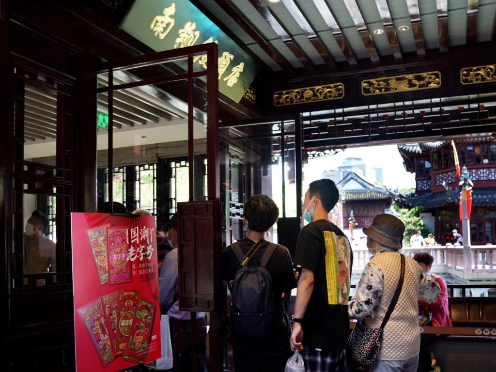 2020年5月12日,在上海豫园南翔馒头店门口,消费者从“国潮”广告牌旁经过。新华社记者 刘颖 摄