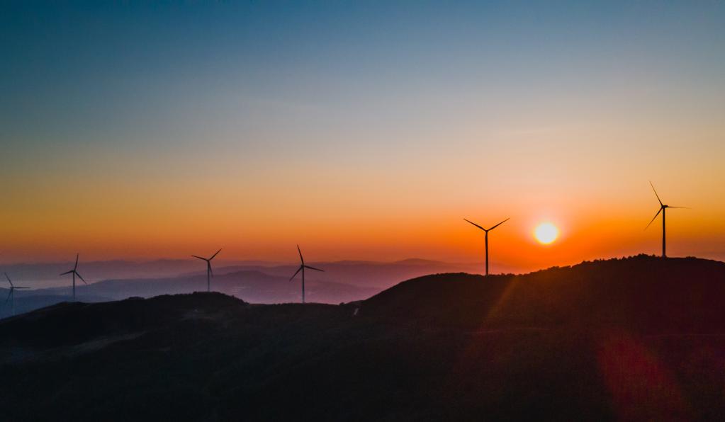 2022年3月3日拍摄的位于云南省华宁县磨豆山的风力发电机(无人机照片)。新华社记者 王冠森 摄