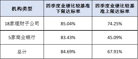 在开放式净值型产品中,18家理财子公司和5家银行的四季度业绩下限达标率平均为83.64%,业绩上限达标率平均为66.82%。其中,6家国有大行理财子公司四季度业绩下限达标率平均为79.09%,中邮理财和农银理财排名领先;6家股份制银行理财子公司的四季度业绩下限达标率平均为85.37%,平安理财和华夏理财排名靠前;城商行理财子公司业绩下限达标率平均为93.77%,杭银理财、南银理财排名领先;5家商业银行的业绩下限达标率平均为83.43%,排名靠前的是浙商银行和渤海银行。