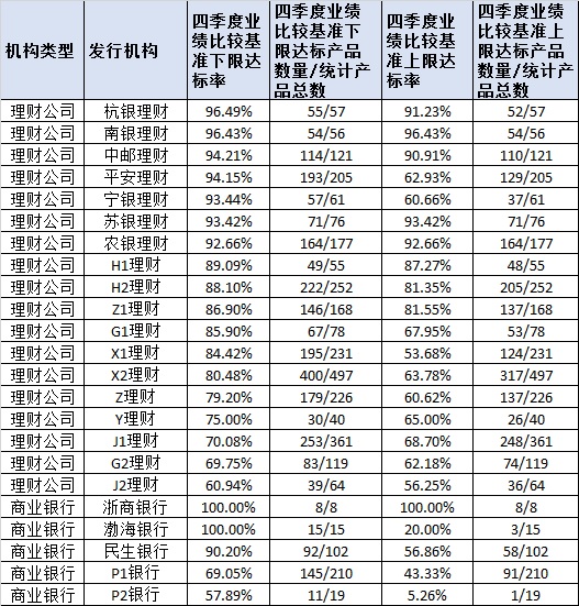 表4 主要理财机构2021年四季度开放式产品业绩达标率