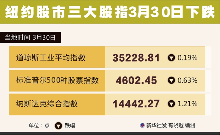 新华社纽约3月30日电(记者刘亚南)纽约股市三大股指30日下跌。