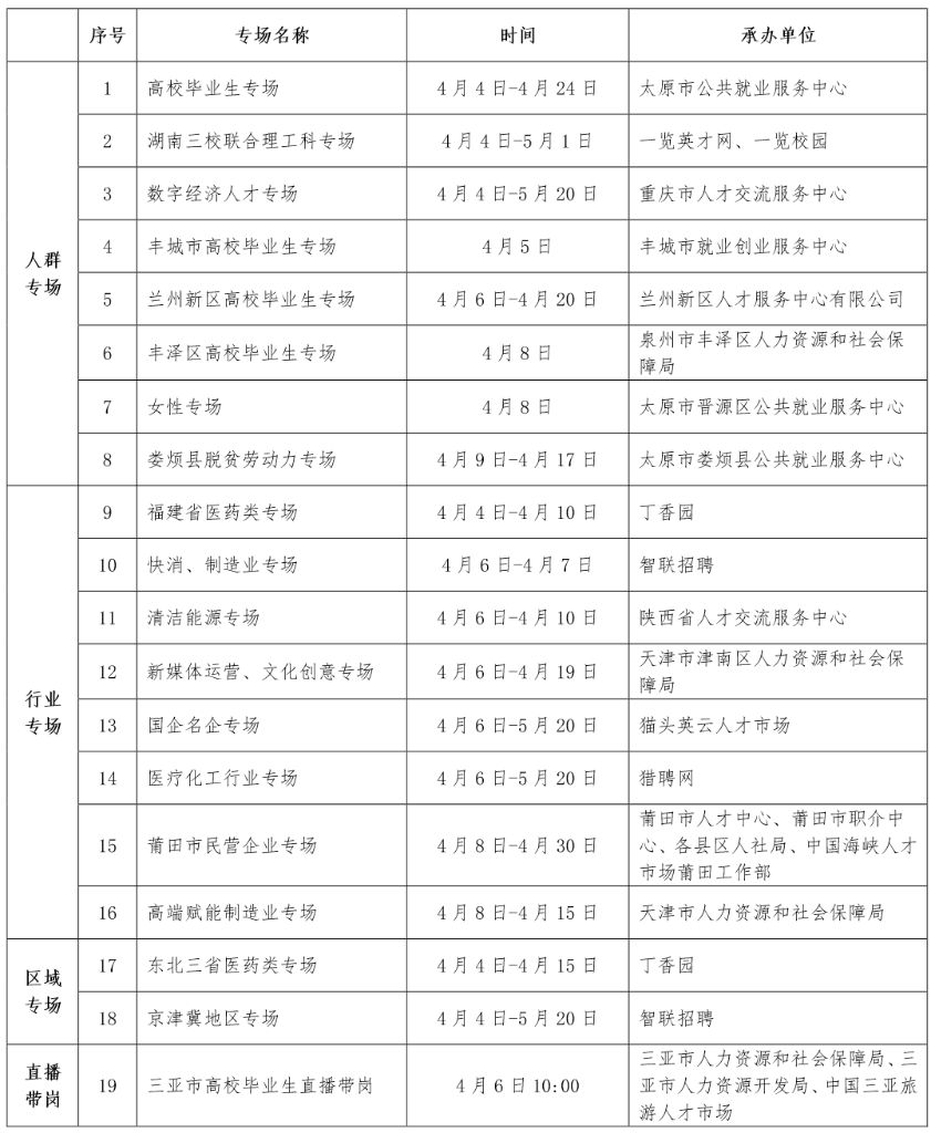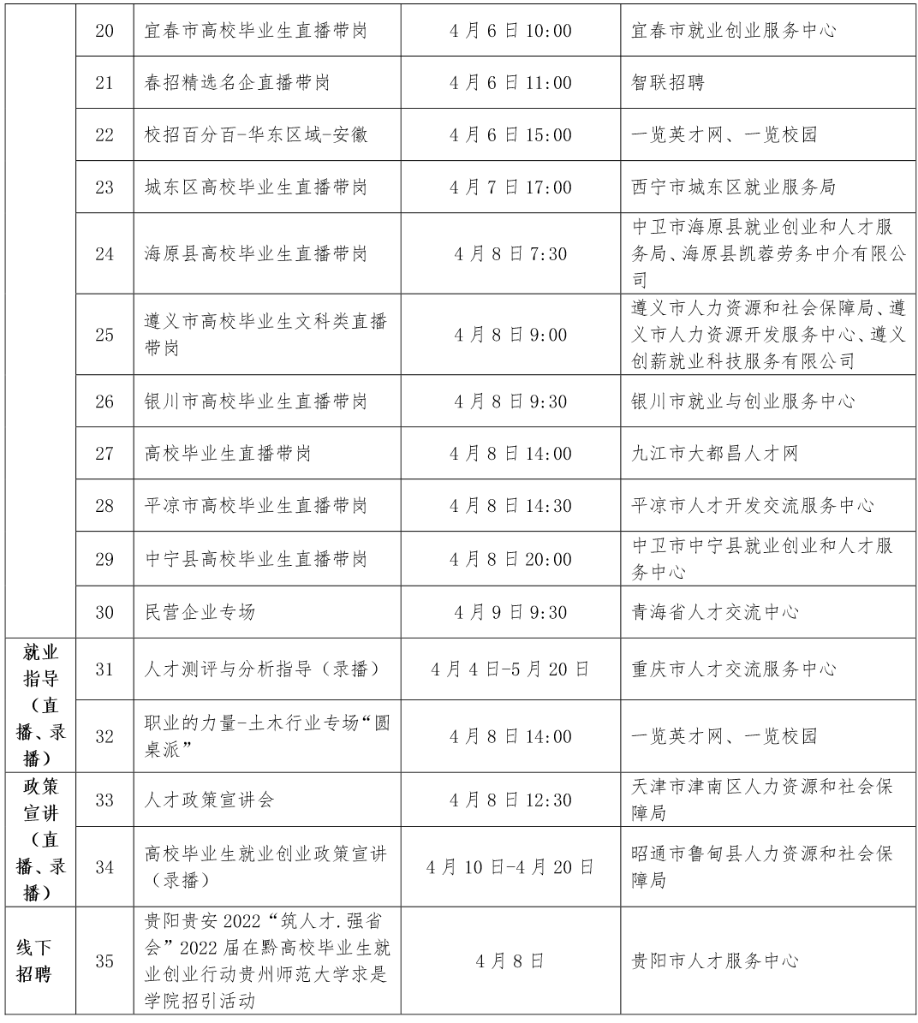 进入四月,就业市场迎来招聘求职高峰期。人力资源和社会保障部2022年大中城市联合招聘高校毕业生专场活动,近期将推出第四批共35场特色服务活动。具体如下: