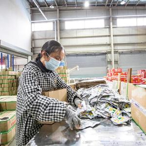 3月24日,在重庆市秀山土家族苗族自治县现代物流园内,一家企业的员工在搬运包装好的方便食品。 新华社记者黄伟 摄