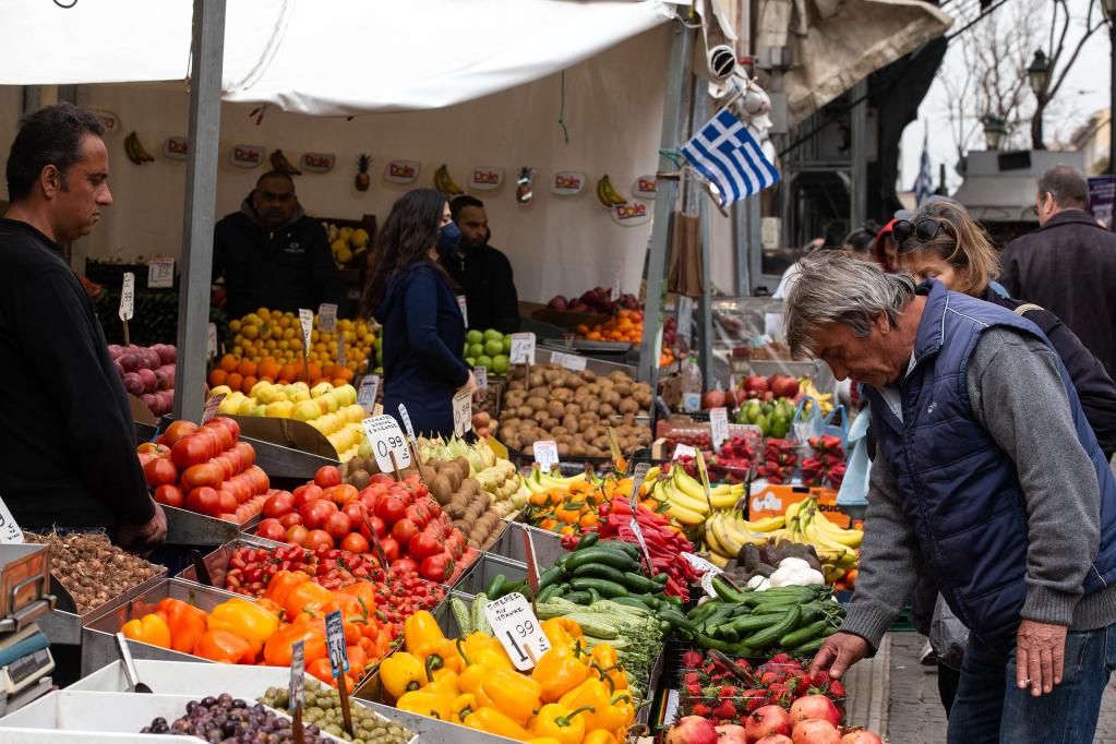 3月31日,一名男子在希腊雅典一处集市购买蔬菜。(新华社发,马里奥斯·罗洛斯摄)
