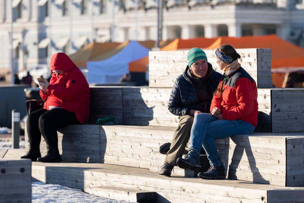 3月16日,人们在芬兰赫尔辛基集市广场享受暖阳。(新华社发,马蒂·马蒂凯宁摄)