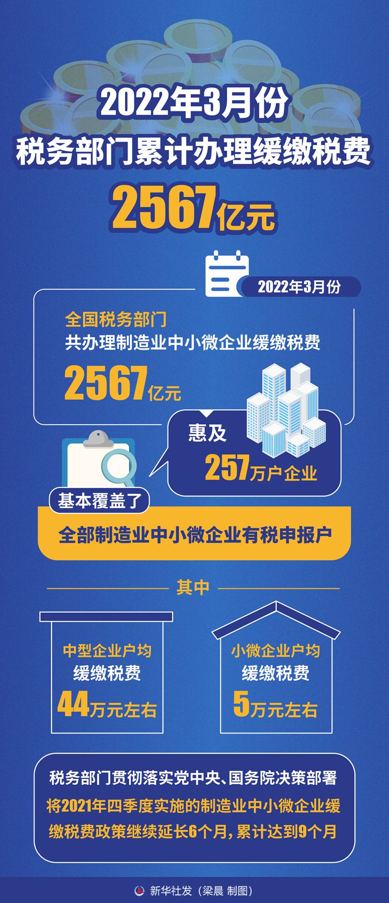 国家税务总局收入规划核算司相关负责人介绍,税务部门贯彻落实党中央、国务院决策部署,将去年四季度实施的制造业中小微企业缓缴税费政策继续延长6个月,累计达到9个月。今年3月份办理缓缴税费2567亿元,其中,中型企业户均缓缴税费44万元左右,小微企业户均缓缴税费5万元左右。