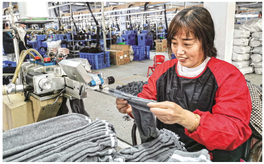 46岁的任玲熟练地给袜子缝线,几秒钟就能缝一双。她以前在浙江的电子厂打工,前年回到在村里开办的企业,每天能缝制七八千双袜子,每月工资5000多元。“老公在浙江送货,我在家门口打工收入也不低,还方便照顾老人孩子。”手脚麻利的任玲面带笑容地说。