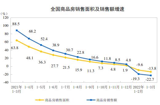 1—3月份,商品房销售面积31046万平方米,同比下降13.8%;其中,住宅销售面积下降18.6%。商品房销售额29655亿元,下降22.7%;其中,住宅销售额下降25.6%。