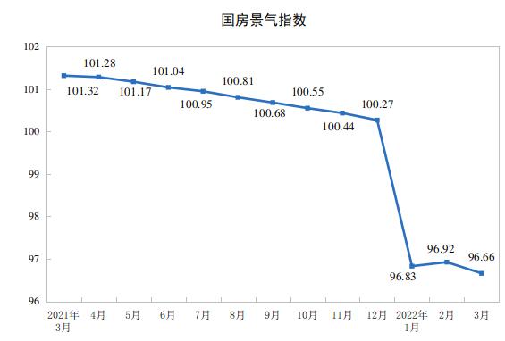 3月份,房地产开发景气指数(简称“国房景气指数”)为96.66。