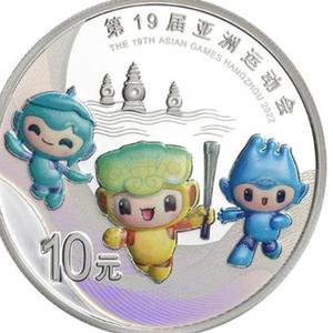 30克圆形银质纪念币背面图案为第19届亚洲运动会吉祥物,辅以火炬、三潭印月、飘带等元素装饰组合设计,并刊“第19届亚洲运动会”等字样。该纪念币含纯银30克,最大发行量2万枚。