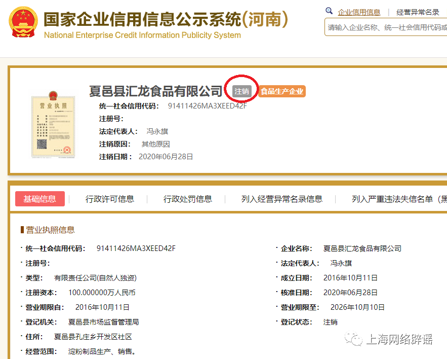 此前,有闵行区虹桥镇的居民在网上爆料,称收到的保障物资中有一款河南省夏邑县汇龙食品有限公司生产的粉丝,但查询企业信用信息公示系统,发现该公司已在2020年6月28日注销。