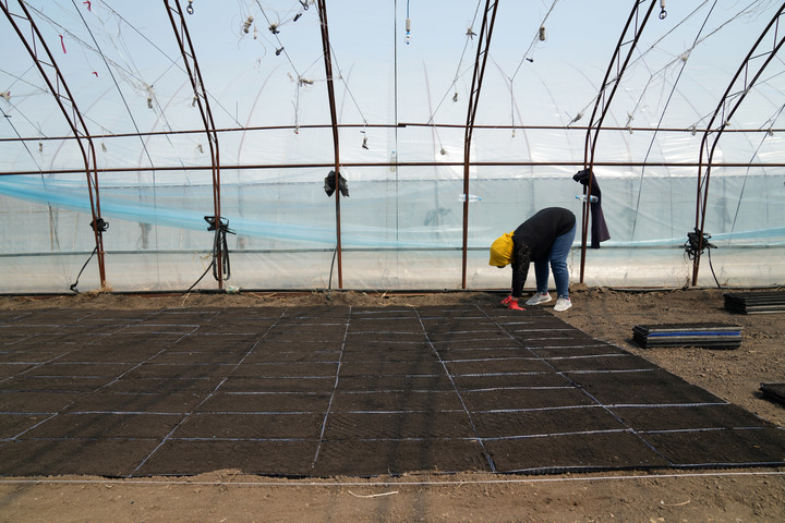 4月19日,在哈尔滨市道外区民主镇光明村一栋育秧大棚内,村民在进行育秧准备工作。新华社记者 王建威 摄