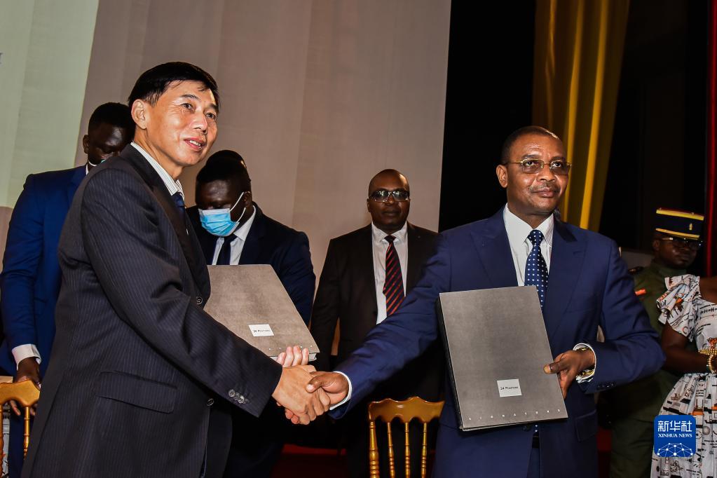 5月6日,在喀麦隆首都雅温得,喀麦隆矿业、工业和技术开发部长加布里埃尔·恩多凯·多多(右)与中钢喀麦隆有限公司总经理郑正豪交换协议。新华社发(科普索摄)