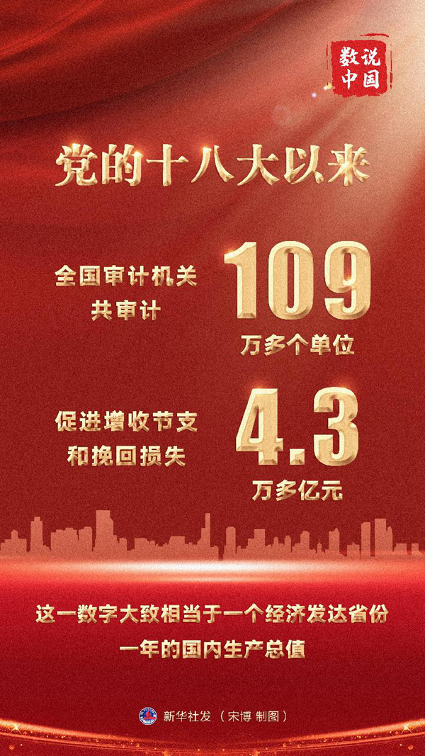 新华社北京5月17日电(记者邹多为、胡锐)党的十八大以来,全国审计机关共审计109万多个单位,促进增收节支和挽回损失4.3万多亿元,这一数字大致相当于一个经济发达省份一年的国内生产总值。