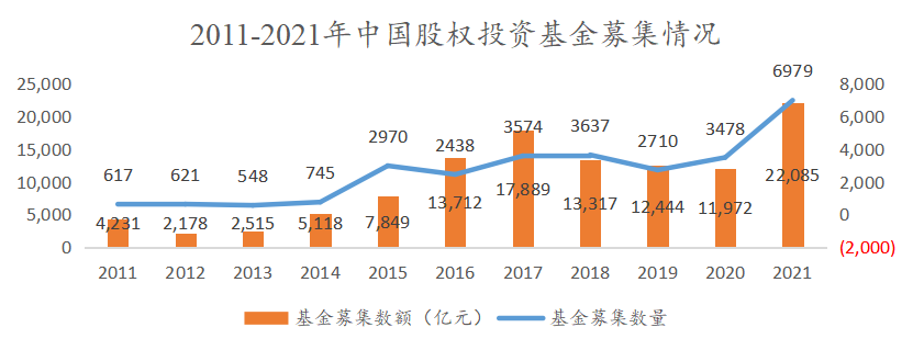 数据显示,最近十年,本土活跃的投资机构从500家增长到近4000家,基金设立数量年平均增长率为27.5%,募集规模年平均增长率18%。2021年,新募基金数近7000支,同比上升100.7%;募资规模约2.21万亿,同比上升84.5%。截至2021年底,中基协备案的股权投资基金共计4.61万支。