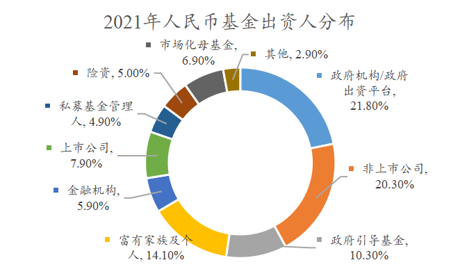 分析股权投资基金背后的出资人结构,根据清科研究报告,人民币基金LP主要以政府机构/政府出资平台、险资、公司(含非上市及上市)、政府引导基金为主,资管新规后,除险资外,其他类金融机构出资占比较小。2021年,从出资金额看,出资额最高的前三大类别为政府机构/政府出资平台、非上市公司、政府引导基金。LP的国资属性和渗透率逐渐提高,越大规模的基金,其基金管理人的国资属性越显著,10亿以上的人民币基金有半数以上由国资背景基金管理人管理。