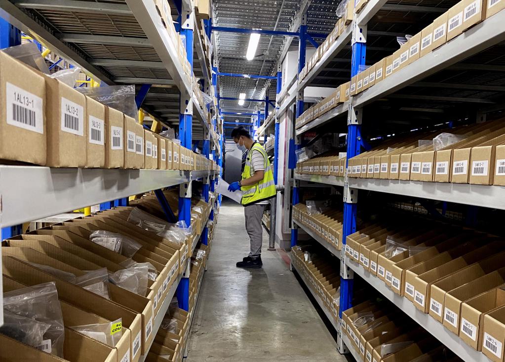 走进分拨中心可以看到,货物按照不同类型分类摆放,工人们正有条不紊地进行打包、称重、整理等工作。这里有来自美国、日本、韩国、荷兰、德国、新加坡等十余个国家和地区的数万种关键零部件,大到大型设备、小到线圈垫片,堪称是集成电路产业不可或缺的家门口“粮仓”。