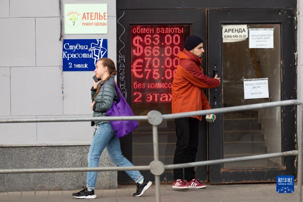 5月24日,在俄罗斯首都莫斯科,行人经过一家外汇兑换点。新华社记者 白雪骐 摄
