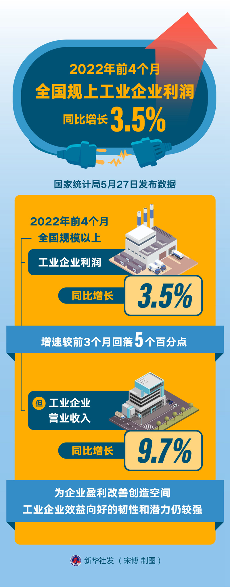 新华社北京5月27日电(记者魏玉坤)国家统计局27日发布数据,今年前4个月,全国规模以上工业企业利润同比增长3.5%,增速较前3个月回落5个百分点。但工业企业营业收入同比增长9.7%,为企业盈利改善创造空间,工业企业效益向好的韧性和潜力仍较强。