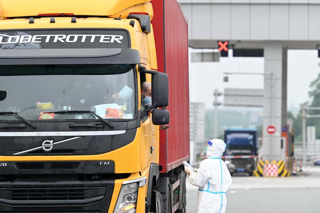 图为5月11日在广西柳州汽车城的高速公路收费站出口,防疫人员为货车驾驶员进行核酸检测采样。 新华社发