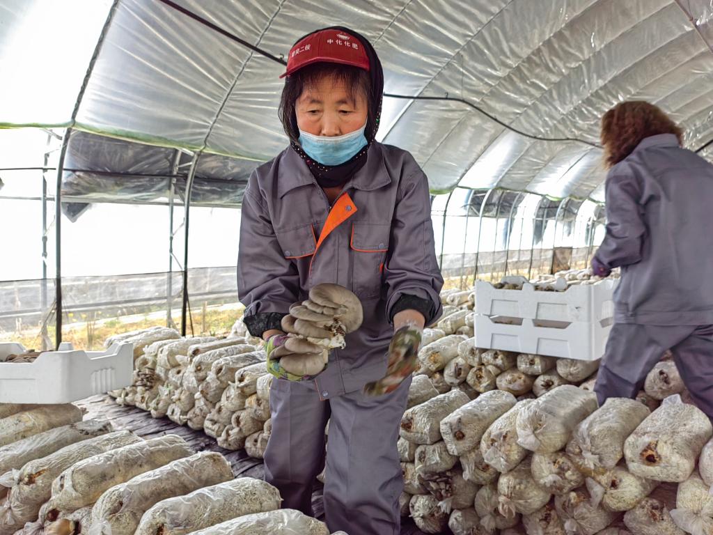 村民吕桂芝正在合作社大棚里弯腰摘平菇。“一天能挣100多元,在家门口就能挣到钱。”吕桂芝说。(记者刘伟、陈聪、王建、梁冬)
