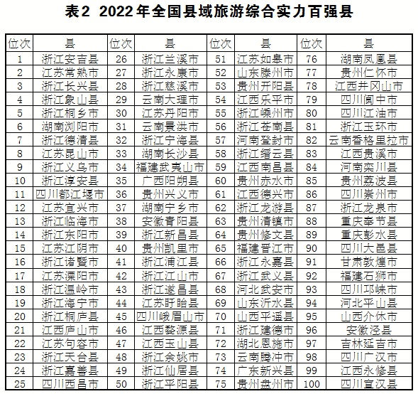 《全国县域旅游研究报告2022》显示,2022年全国县域旅游综合实力百强县分布在19个省区市。具体分布为:浙江占35席,四川占10席,贵州、江苏、江西均占9席,湖南、云南占4席,福建占3席,安徽、河北、河南、山东、山西、重庆均占2席,甘肃、广东、广西、湖北、吉林各有1席。前十强中,浙江表现突出,占7席,湖州安吉县连续4年位居全国县域旅游综合实力百强县榜首。