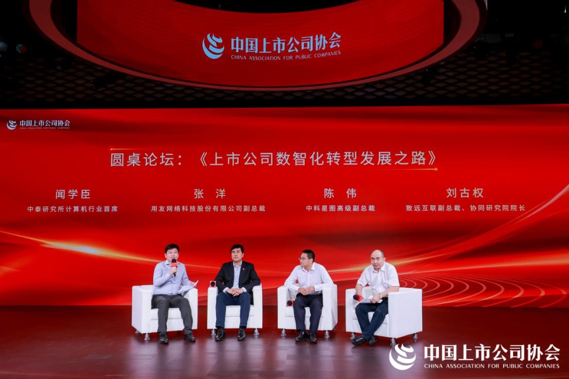 在圆桌论坛环节,中泰证券中泰研究院计算机行业首席闻学臣,中科星图高级副总裁马守朋,致远互联副总裁、协同研究院院长刘古权,用友网络副总裁张洋围绕“上市公司数智化转型发展之路”这一话题展开讨论,就上市公司数字化转型的具体路径,如何搭建数字经济交流、合作、促进平台等建言献策。