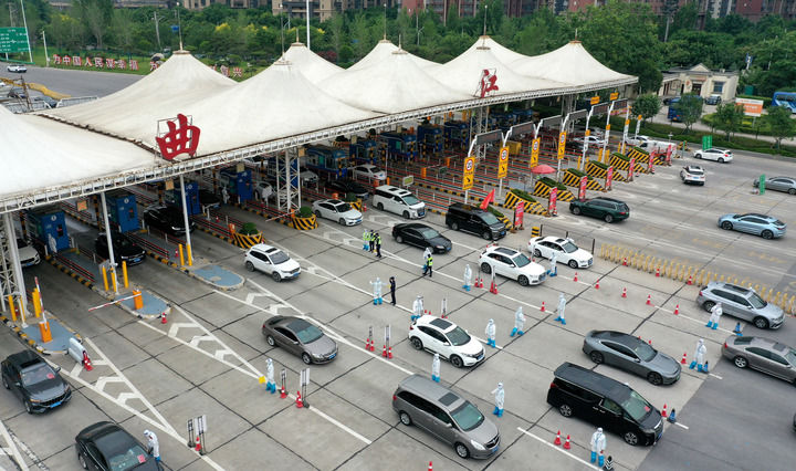 在西安绕城高速曲江收费站,车辆有序通行(5月21日摄,无人机照片)。新华社记者 刘潇 摄