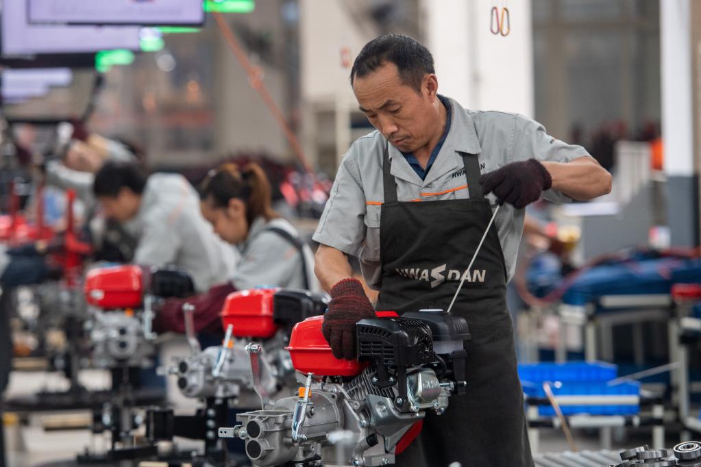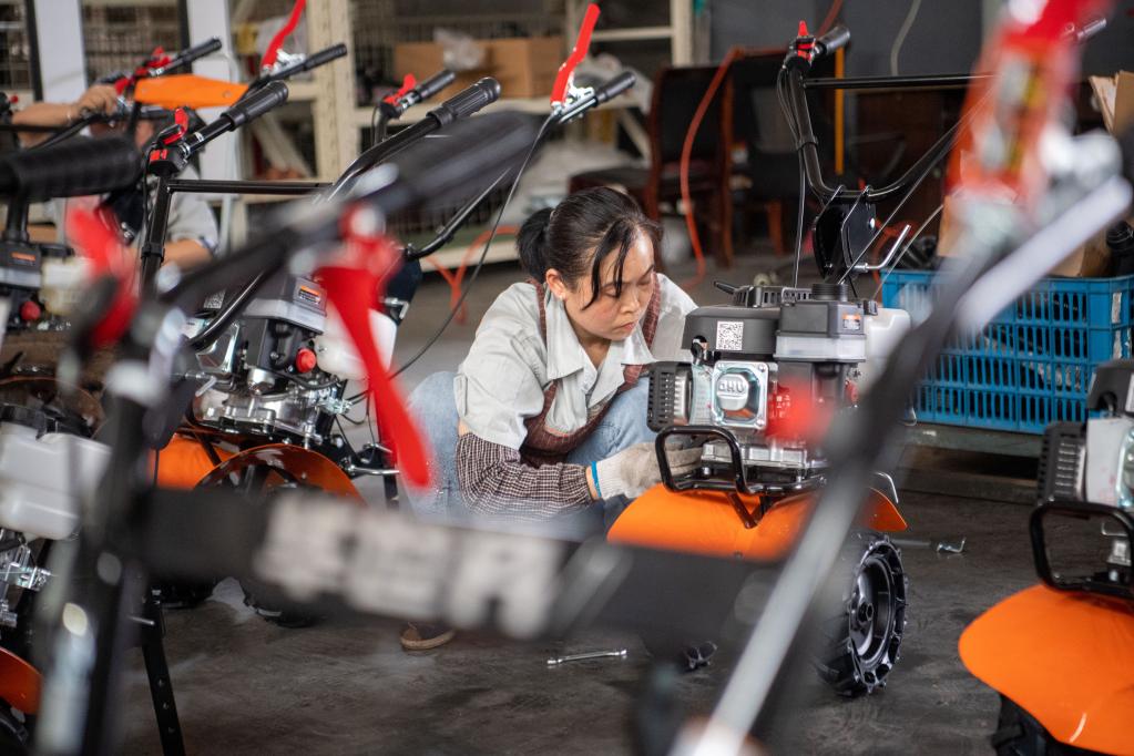 5月30日,在华世丹机械车间内,工人在生产线上组装生产小型农用机械。新华社记者 唐奕 摄