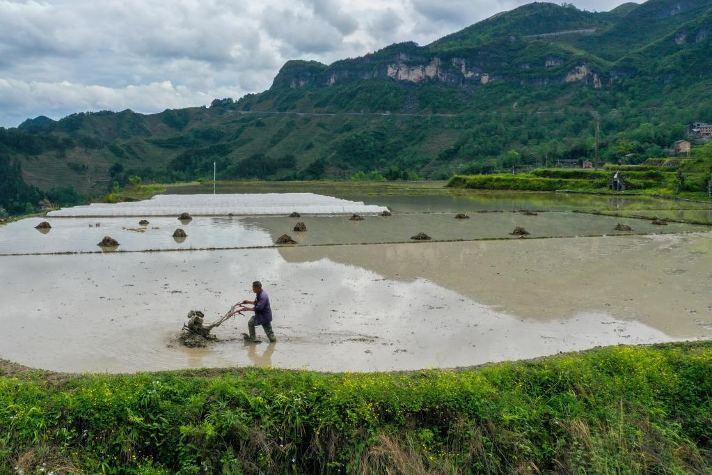 4月25日,重庆市酉阳县花田乡,稻农在水田里使用小农机进行劳作(无人机照片)。新华社记者 唐奕 摄
