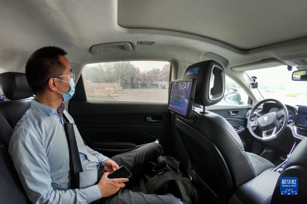 在北京经济技术开发区,一名乘客在体验“主驾无人、副驾驶配备安全员”的无人驾驶车(2022年4月25日摄)。新华社记者 彭子洋 摄
