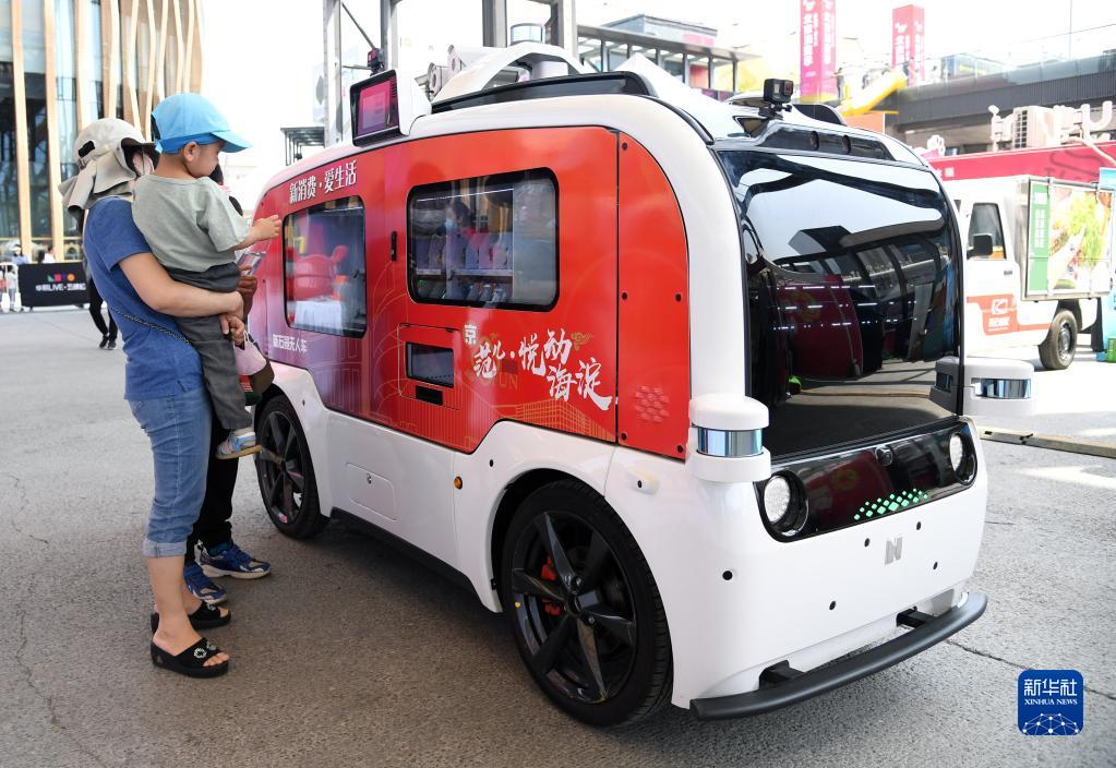 在“北京消费季·悦动海淀”活动现场,市民通过城市综合服务无人车购买饮品(2020年6月6日摄)。新华社记者 任超 摄