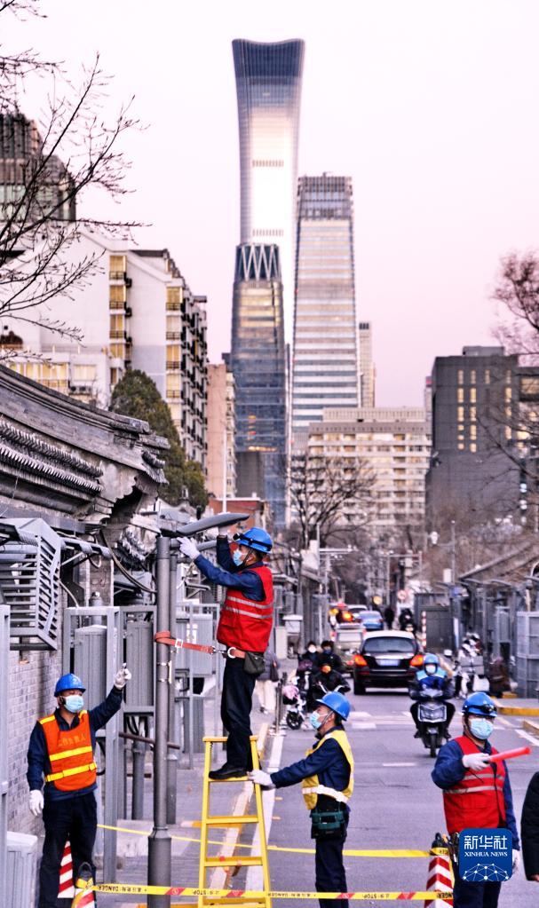 北京市城市照明管理中心的技术人员在检测小街巷中的路灯(2021年12月31日摄)。新华社记者 李欣 摄