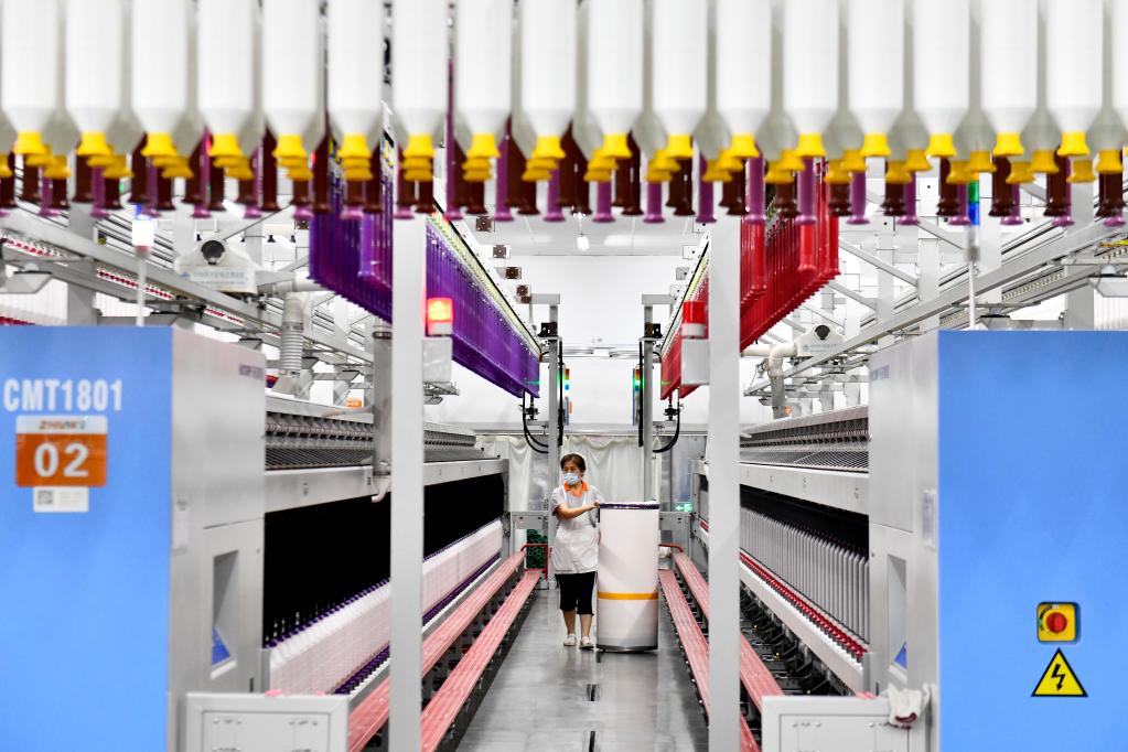 7月15日,江苏省海安市南莫镇一家纺织公司生产车间内,工人在生产线上工作。(新华社发,翟慧勇摄)