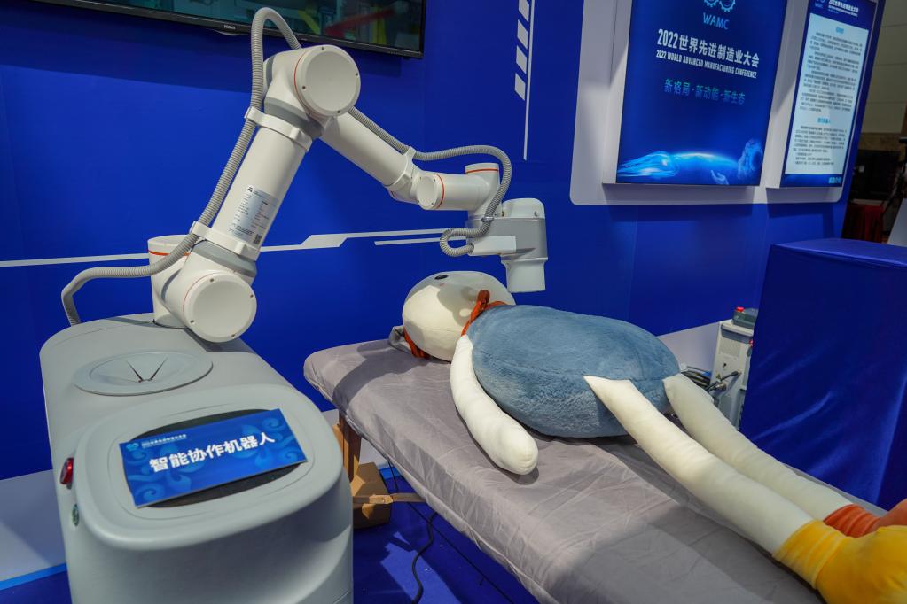 图为纽氏达特机器人系统技术有限公司在2022世界先进制造业大会上展示的智能协作机器人正在模拟艾灸。新华社记者朱峥 摄