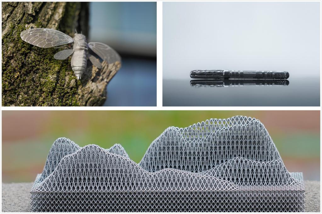 在工艺品展区,一个利用3D打印完成的“秦岭”工艺品引人注目。这个长约20厘米、高约9厘米的摆件呈网状结构,金属丝弦纵横交错,“织”起秦岭的山脉连绵。“秦岭”旁边,一个由钛合金打造的金属“蝉”栩栩如生,通体采用镂空设计而成,蝉翼轻薄似纱,却又坚硬如铁。
