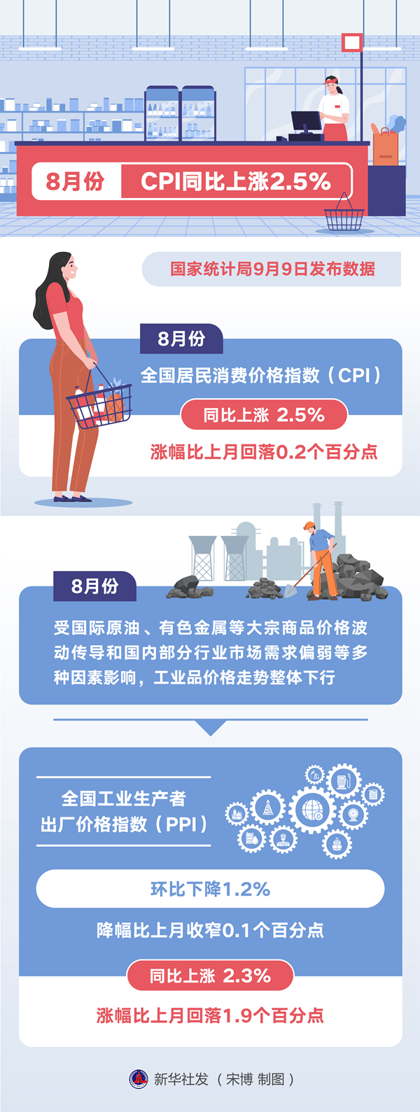 新华社北京9月9日电(记者申铖、魏玉坤)国家统计局9日发布数据,8月份,全国居民消费价格指数(CPI)同比上涨2.5%,涨幅比上月回落0.2个百分点。