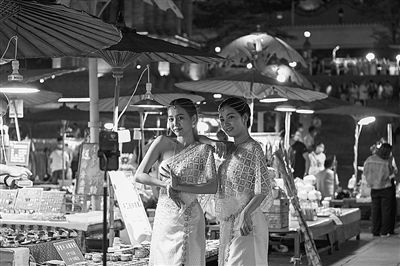 游客在云南省西双版纳景洪市告庄西双景的星光夜市自拍。新华社记者 曹梦瑶 摄