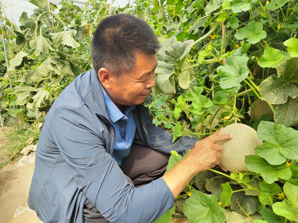 曹辉在合作社温棚内查看网纹瓜长势。(新华社记者张亮摄)