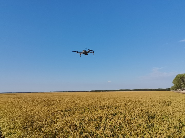 9月8日,航拍无人机在红卫农场有限公司稻田上空进行巡田作业。(受访者供图)